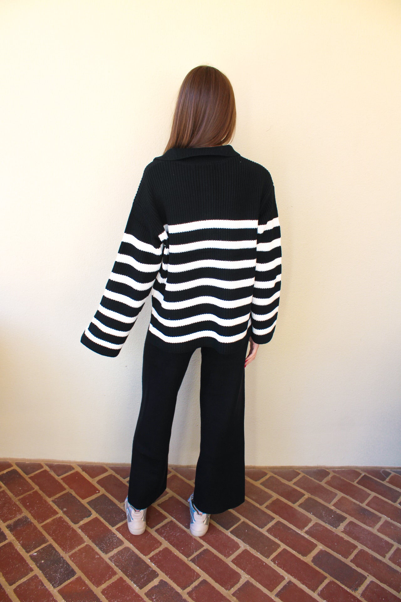 Emily is 5’6 wearing a size small.- Black & White Pullover.- Quarter Zip Up.- True To Size.