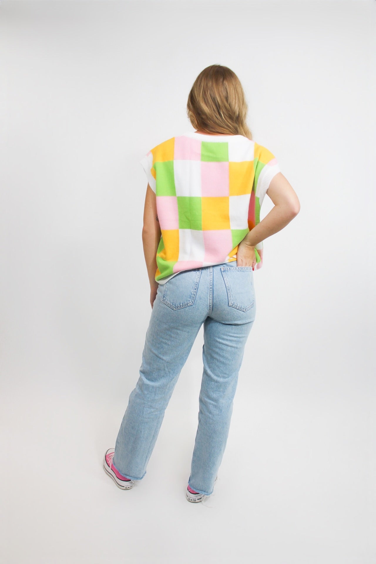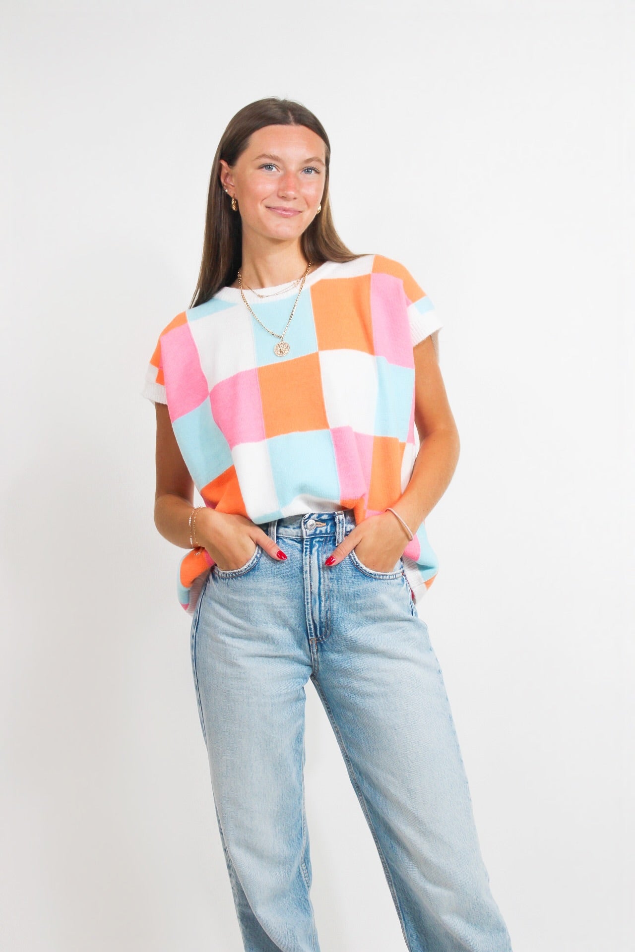Emily is 5’6 wearing a size small.Morgan is 5’4 wearing a size small.- Oversized.- Checkered Pattern.- Sweater Top.
